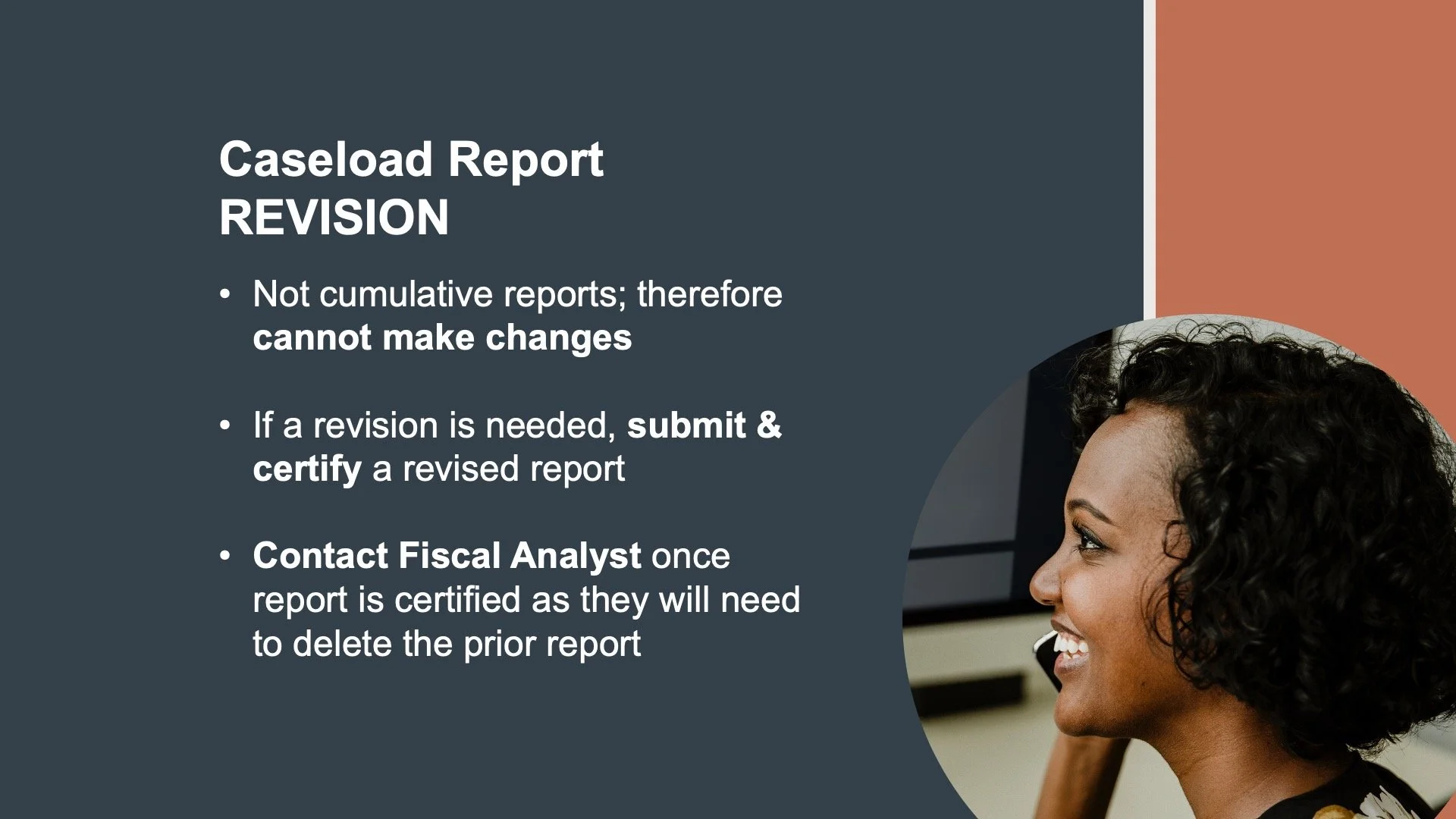 Caseload Reports are not cumulative reports; therefore, changes cannot be made to a single column as you can with the fiscal report. If a revision is needed once it’s been certified as being complete, you will need to submit & certify an entirely new report. Then, notify your Fiscal Analyst as they will need to delete the prior report.