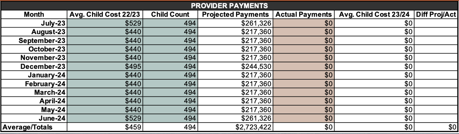 The projected provider payments will populate based on the average child cost times the child count for each month.