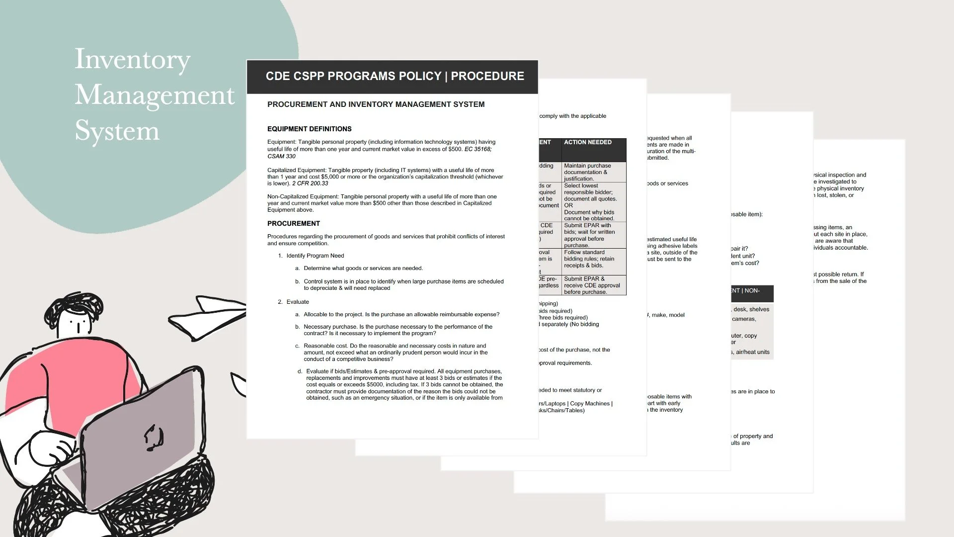 Below is a snapshot of a SAMPLE Inventory Management System that is broken down into 4 categories: Procurement, Recordkeeping, Monitoring & Maintenance, and Inventory Updates.