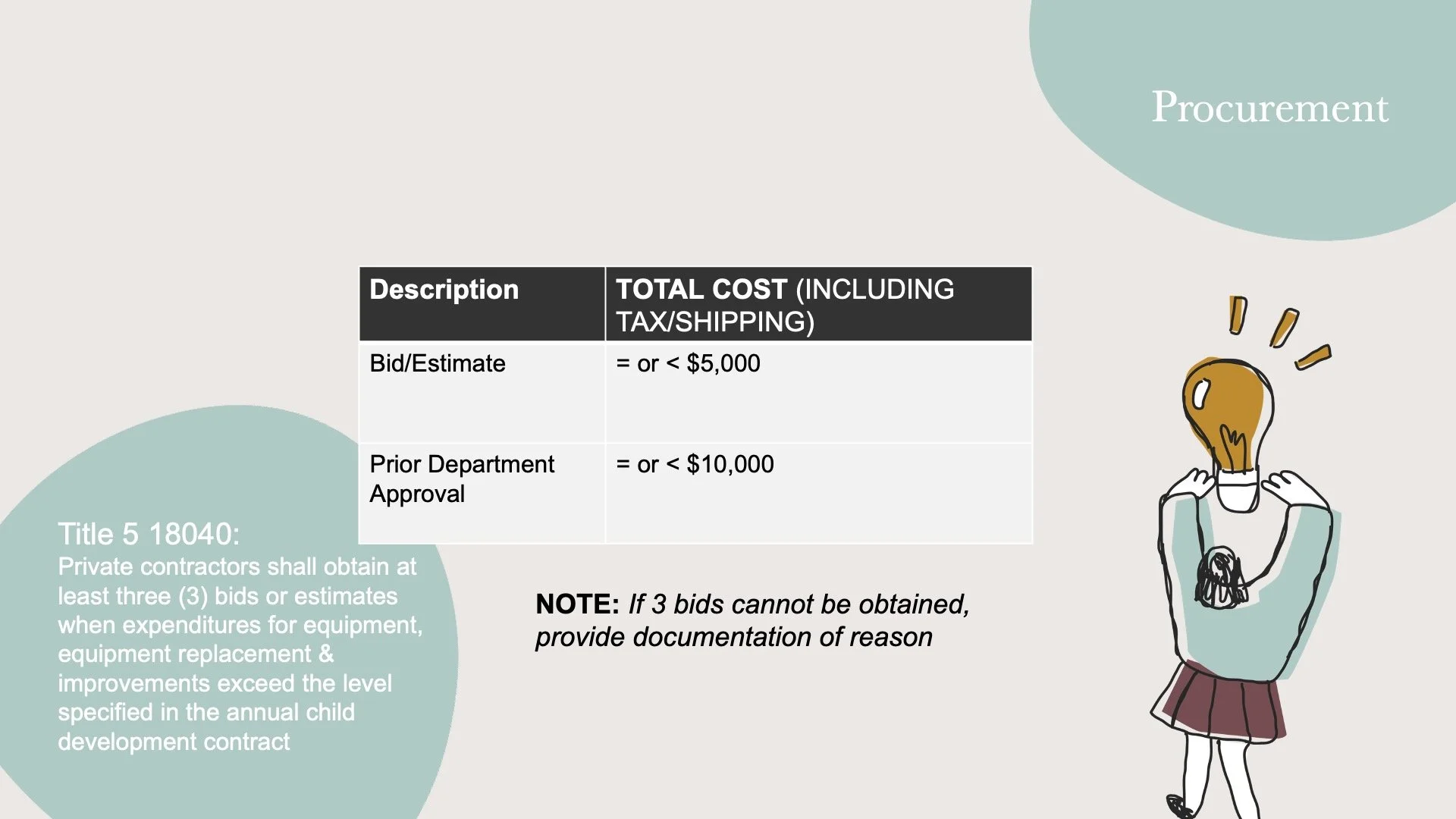 The contractor has adopted procedures for managing equipment, purchased in whole or in part with early education contract funds until disposition of the item. In addition, the requirements above, the contractor has: