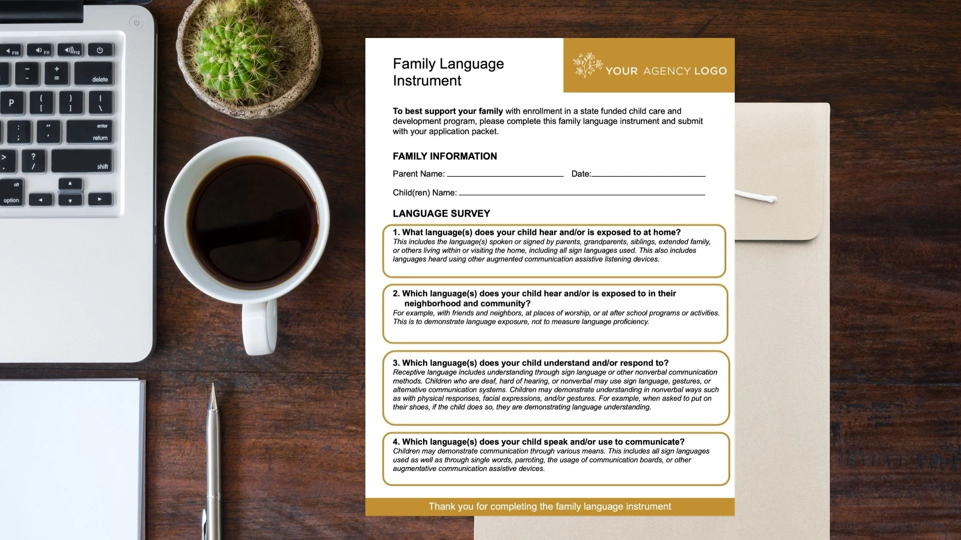 The Family Language Instrument is a four question survey that can be included within the enrollment packet for families to complete as part of the application process or asked through an interview process with the child’s family.